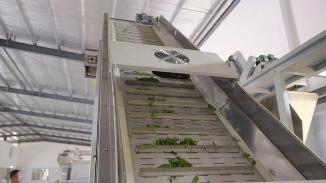 我身后就是粤东首条莲花山茶全自动生产线。从刚刚的茶园新鲜采摘下来的嫩芽,在经过了一定时间的摊放之后,便进入这条高科技生产线。