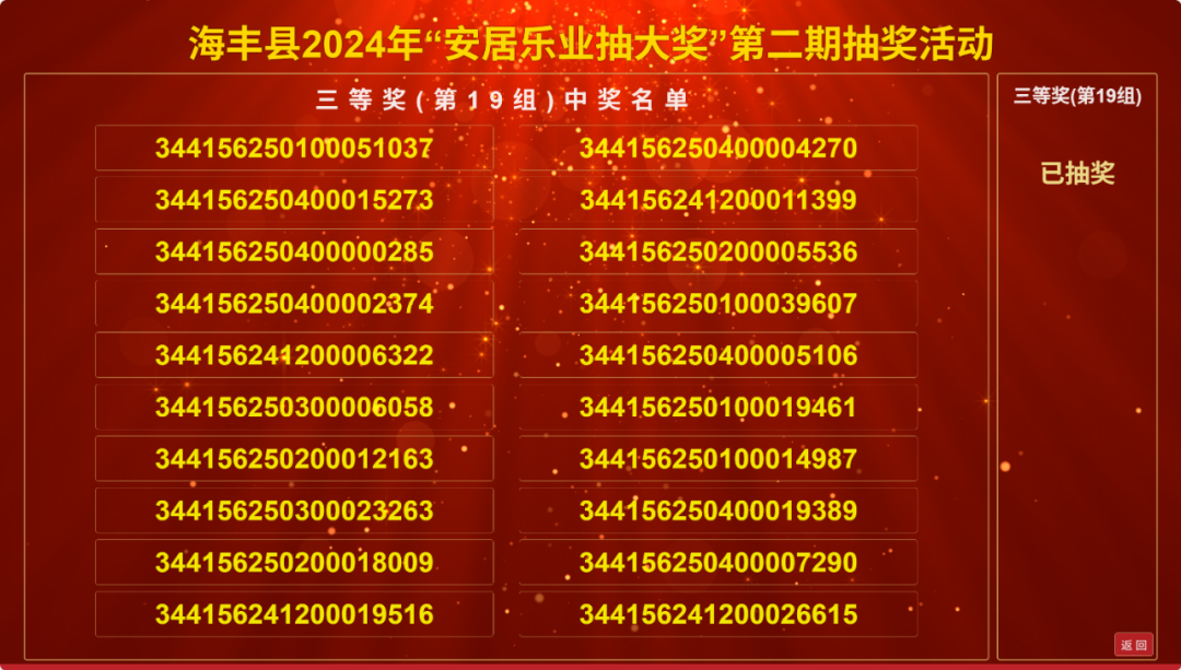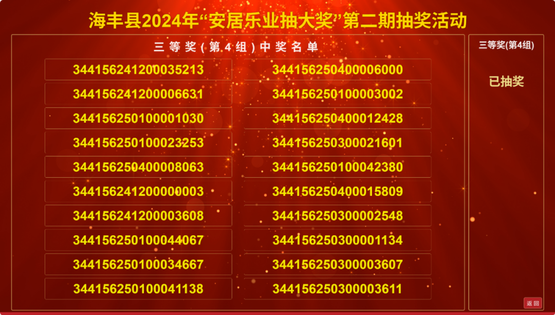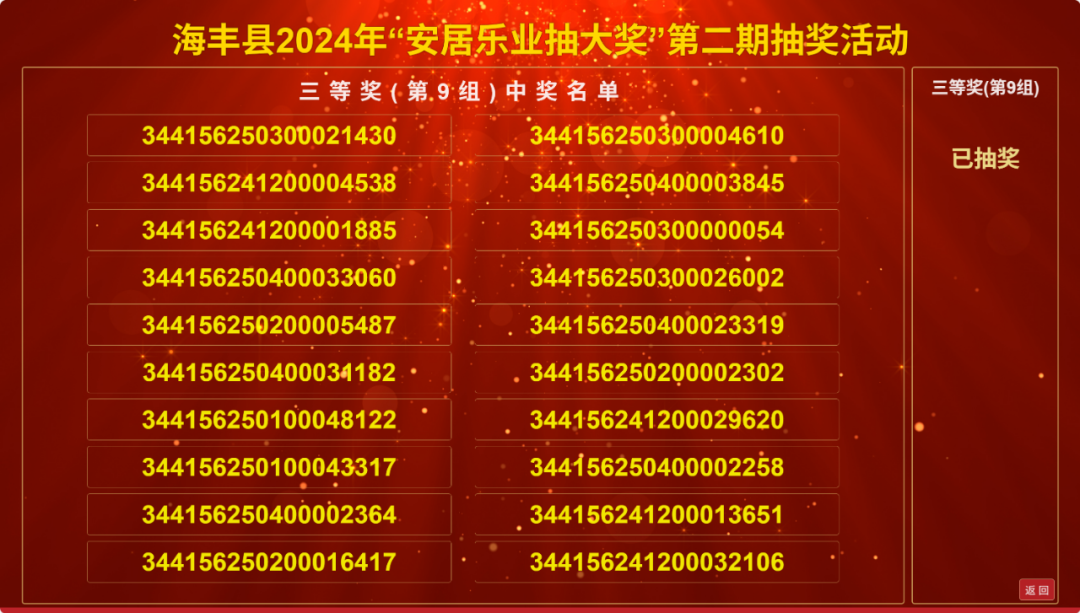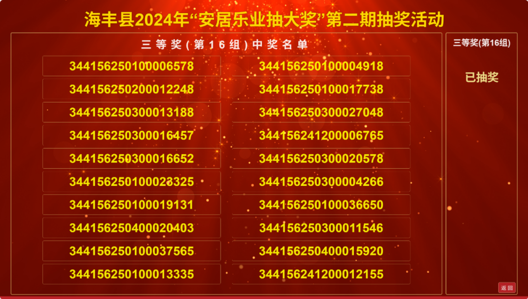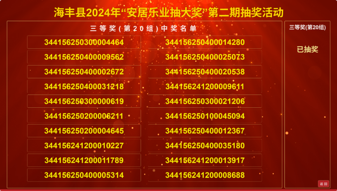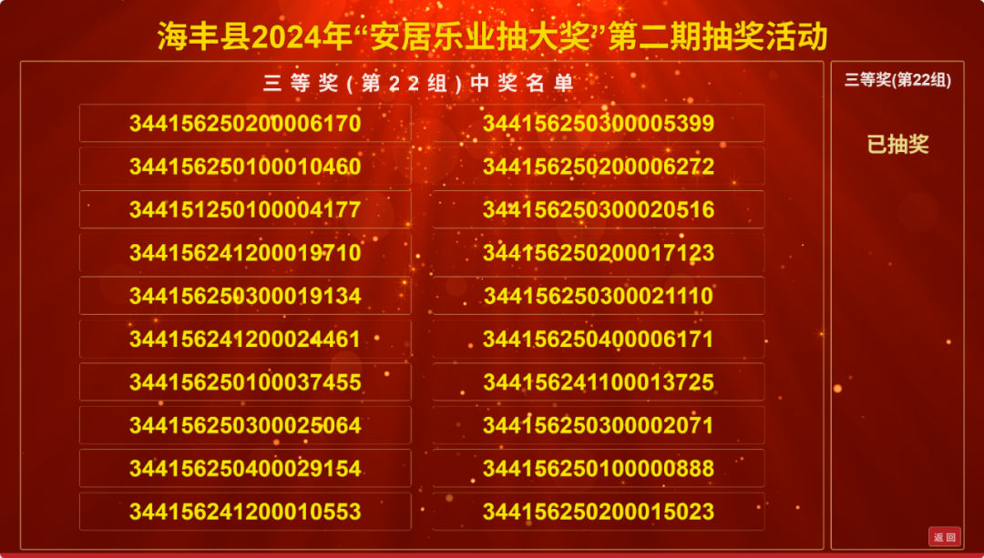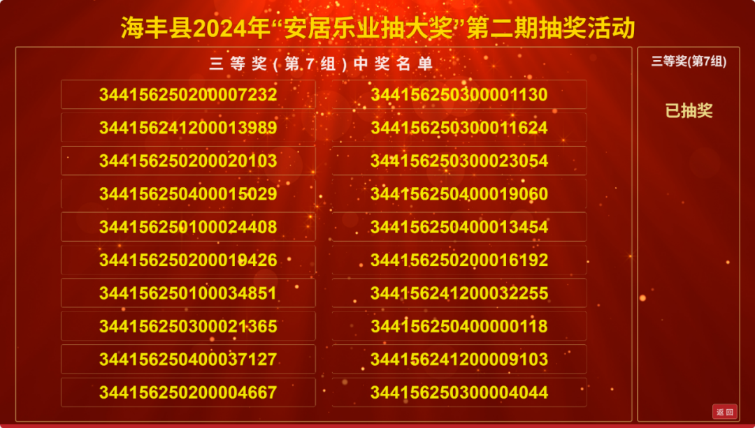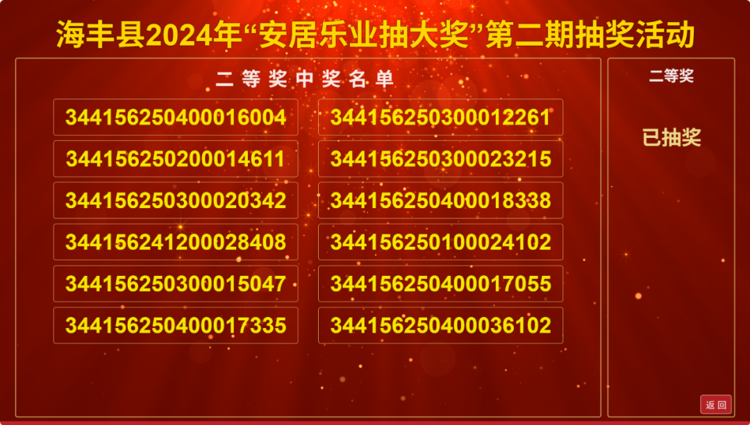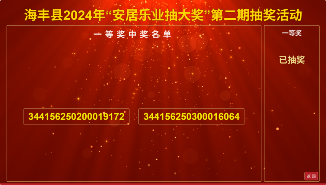 5月8日,“安居乐业抽大奖”第二期抽奖活动采用线上抽奖系统,在公证人员全程监督下,共抽中一等奖2名、二等奖12名、三等奖500名,奖金总额33万元,并当场公布结果。