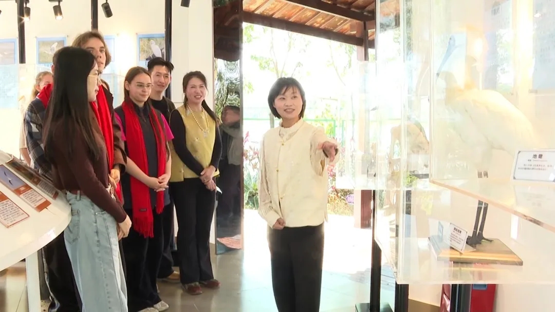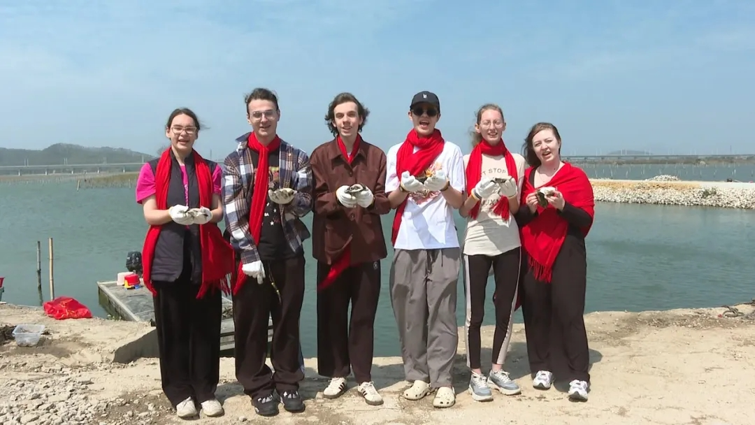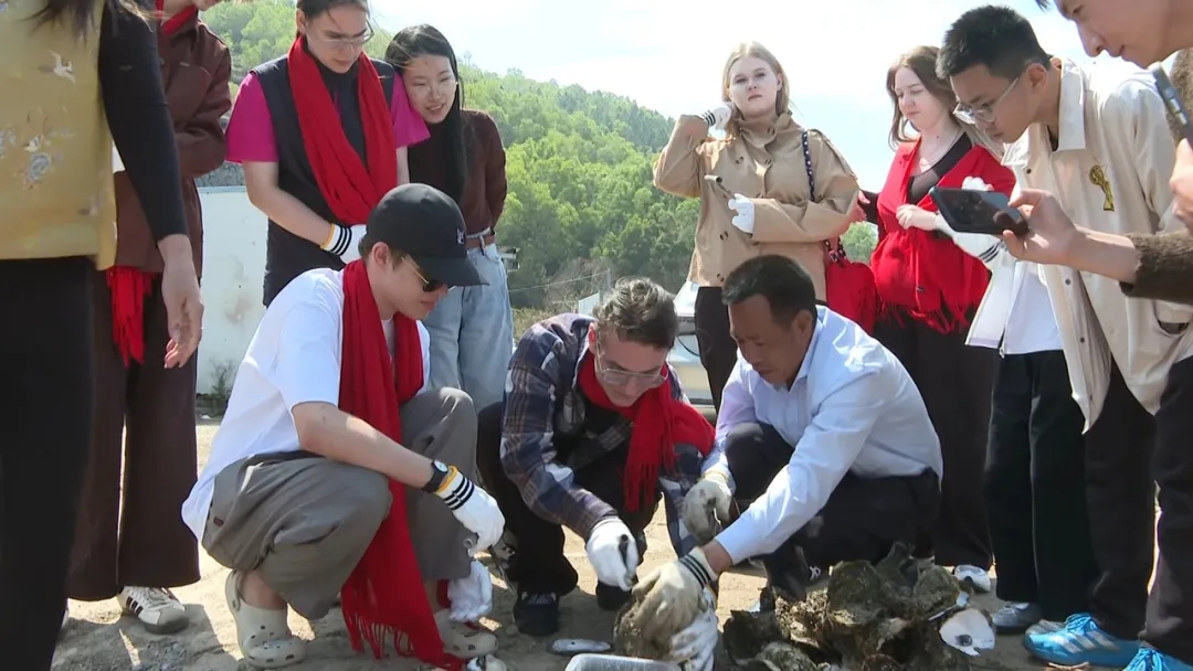 从茶山下来,师生们来到联安镇和大湖镇,探访文化场馆和农文旅融合打卡点,沉浸式体验海丰文化和生态之美。冬日暖阳下的生态湿地,候鸟翩飞,绿水青山间生机盎然。透过望远镜,留学生们远眺湿地深处成群结队的白鹭与野鸭,切身感受海丰自然环境的和谐与美好。留学生们不仅饱览了湖光山色,还体验了一把开生蚝、品生蚝的渔家乐趣。大家兴致盎然,当肥美鲜甜的大湖高螺生蚝入口时,不约而同地想起著名主持人撒贝宁那句“汕尾的生蚝没吃过,白活了”的赞叹,并笑着用中文隔空回应。