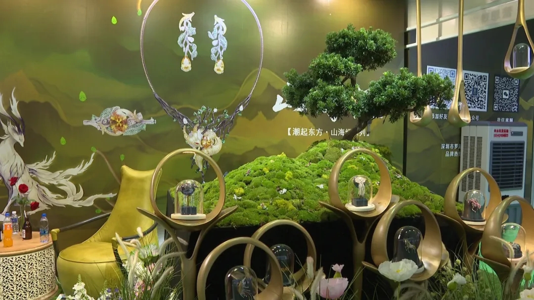 展会期间,梅陇分会场的金银首饰展厅人头攒动,融合传统工艺与现代设计的首饰精品集中亮相。从镶嵌着彩色宝石的时尚套链到复刻非遗技艺的古法金饰,每一件展品都彰显着梅陇匠心。其中,蕾恩珠宝展位推出的融《山海经》《璀璨梨园》的文创新品惊艳亮相,吸引国内外采购商驻足观赏、洽谈订单。