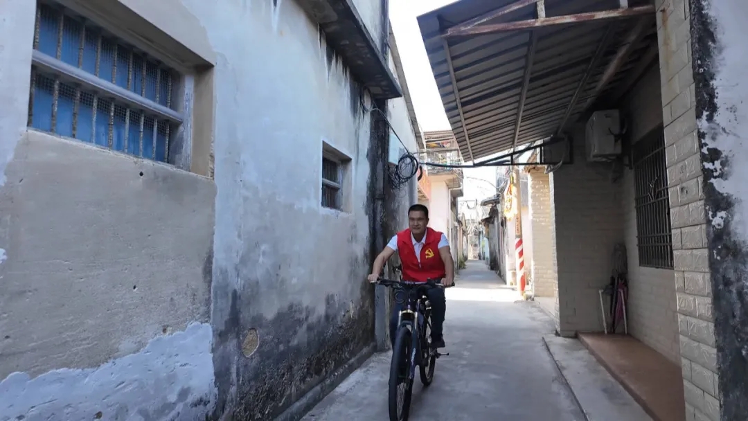日兴社区是公平镇的老社区,巷道也比较窄。要跟群众沟通交流,只能利用这单车来转转。比如阿叔这一户,他老婆得了病,家庭也比较困难,治疗费用也比较大。现在我就定期过来帮他们解决一下这个事情,希望通过我的努力,进一步帮助他们家庭解决这个治疗费用的问题。