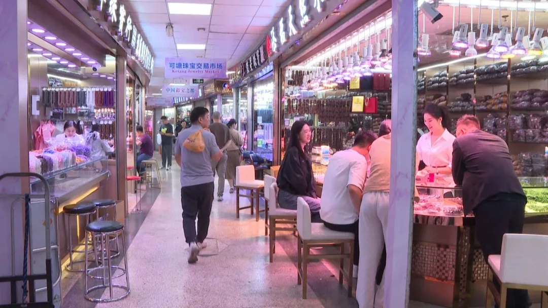 在珠宝交易市场,天然水晶、南红玛瑙、彩色宝石等各类饰品琳琅满目,店主们热情地向过往顾客介绍产品的材质、工艺与设计,不少消费者驻足挑选,交易场景十分热闹。
