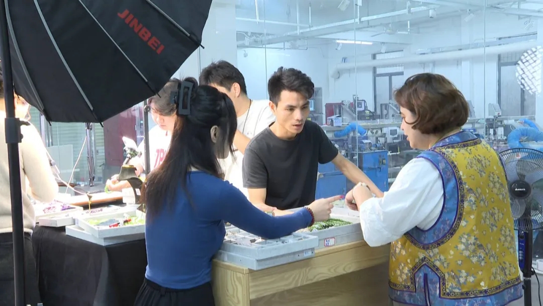 在可塘镇华清珠宝的生产车间里,打磨机的嗡鸣声、钻石刀的切割声交织成激昂的生产旋律,工人正专注地进行原石的切割、打磨、镶嵌等工序;直播间里,主播们将镜头对准精美的彩宝首饰,详细介绍产品的材质、工艺和设计理念,弹幕实时刷屏,订单持续涌现,工作人员有条不紊地将成品首饰进行清洁、质检、装盒。