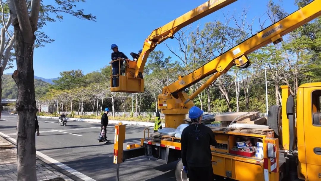与此同时,莲花大道的路灯集中维修行动同步推进。技术人员分工协作、高效联动,更换损坏的灯泡和灯罩;地面上,检修、排查电路故障。从高空作业到地面维修,每一处细节都彰显着对市民夜间出行安全的用心守护。