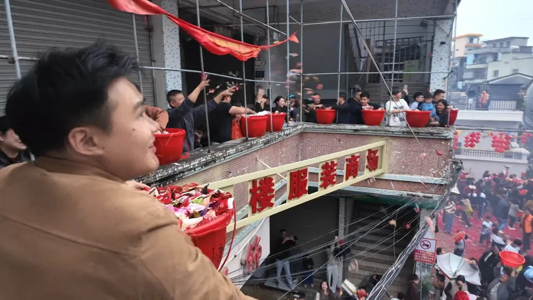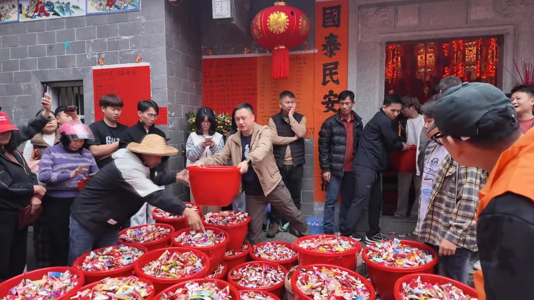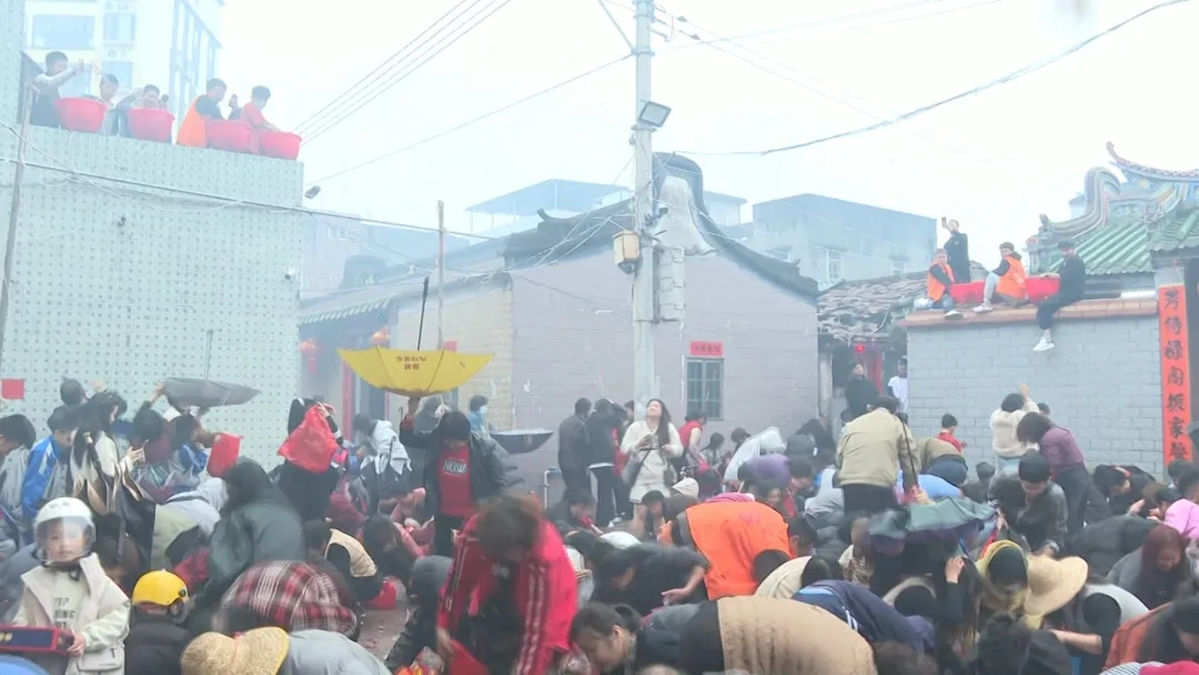 随着鞭炮声响落,寓意吉祥的丁糖从高处纷纷抛洒而下,现场瞬间沸腾。大人、孩童争相捡拾,欢声笑语此起彼伏,每个人脸上都洋溢着幸福喜悦,处处洋溢着祥和喜庆的节日气息。