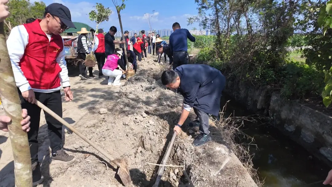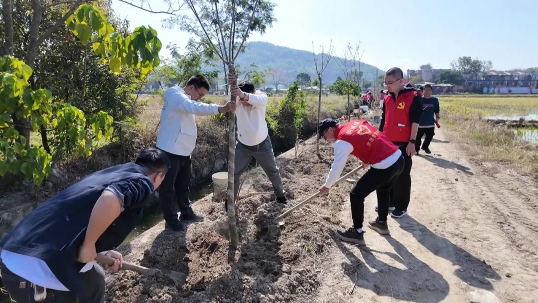 植树现场,大家分工协作、配合默契,扶苗正位、培土夯基、提水浇灌,每一个环节都认真细致、有条不紊。党员干部带头冲锋,志愿者主动担当,群众积极参与,形成了“党员示范、全民参与”的良好氛围。此次活动精心挑选了樟树、风铃木等适宜本地生长的树种,累计栽种树苗近100株,为乡村再添新绿。