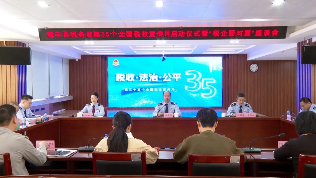 4月1日,海丰县税务局以“税收·法治·公平”为主题,启动第35个全国税收宣传月活动,并同步举行“税企面对面”座谈会,搭建税企沟通桥梁,共话营商环境优化。