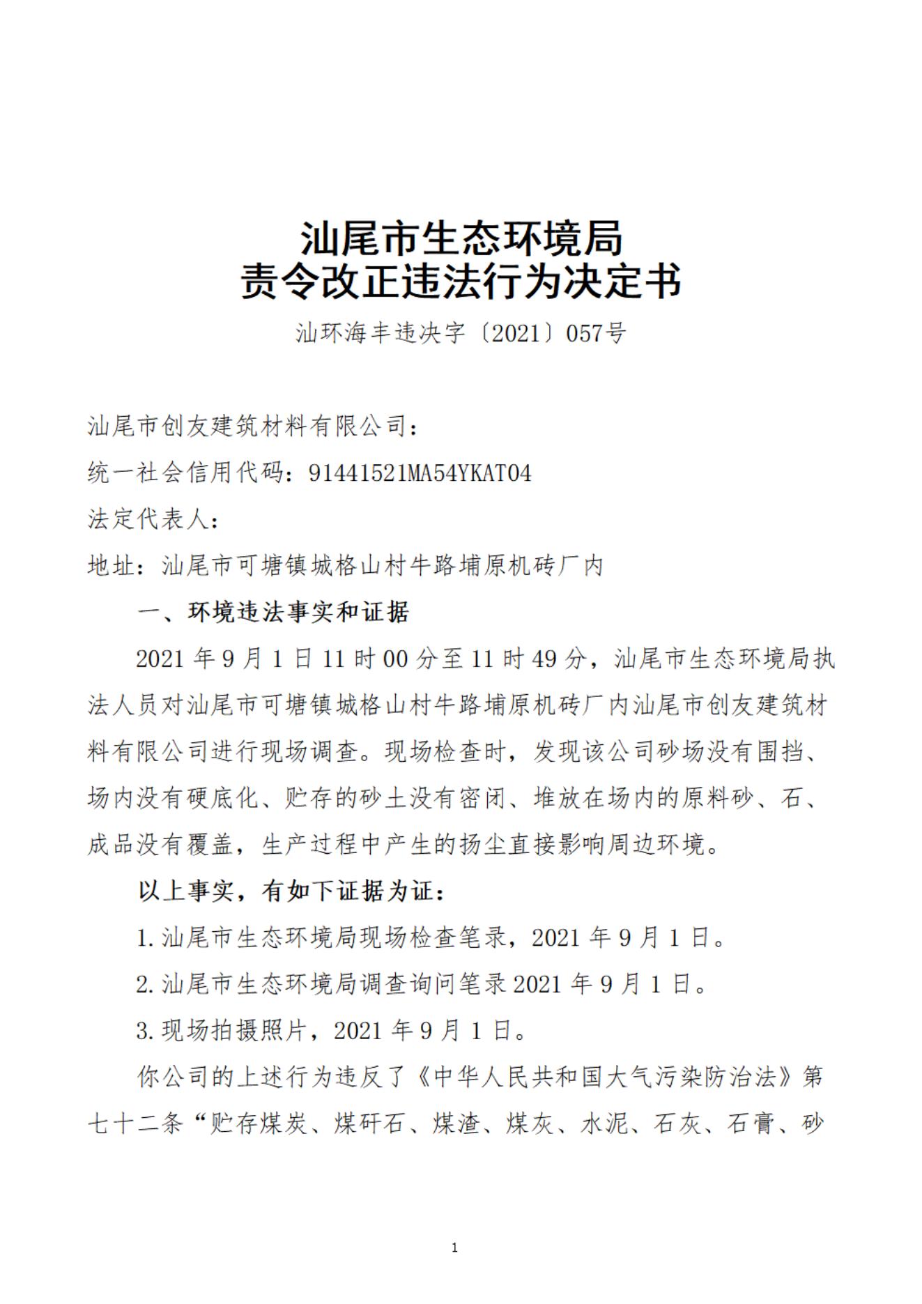 责令改正违法行为决定书(汕尾市创友建筑材料有限公司)