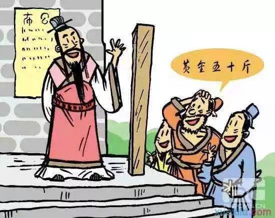春秋战国时,秦国的商鞅在秦孝公的支持下主持变法。当时处于战争频繁、人心惶惶之际,为了树立威信,推进改革,商鞅下令在都城南门外立一根三丈长的木头,并当众许下诺言:谁能把这根木头搬到北门,赏金十两。围观的人不相信如此轻而易举的事能得到如此高的赏赐,结果没人肯出手一试。于是,商鞅将赏金提高到50金。重赏之下必有勇夫,终于有人站起将木头扛到了北门。商鞅立即赏了他五十金。商鞅这一举动,在百姓心中树立起了威信,而商鞅接下来的变法就很快在秦国推广开了。新法使秦国渐渐强盛,最终统一了中国。