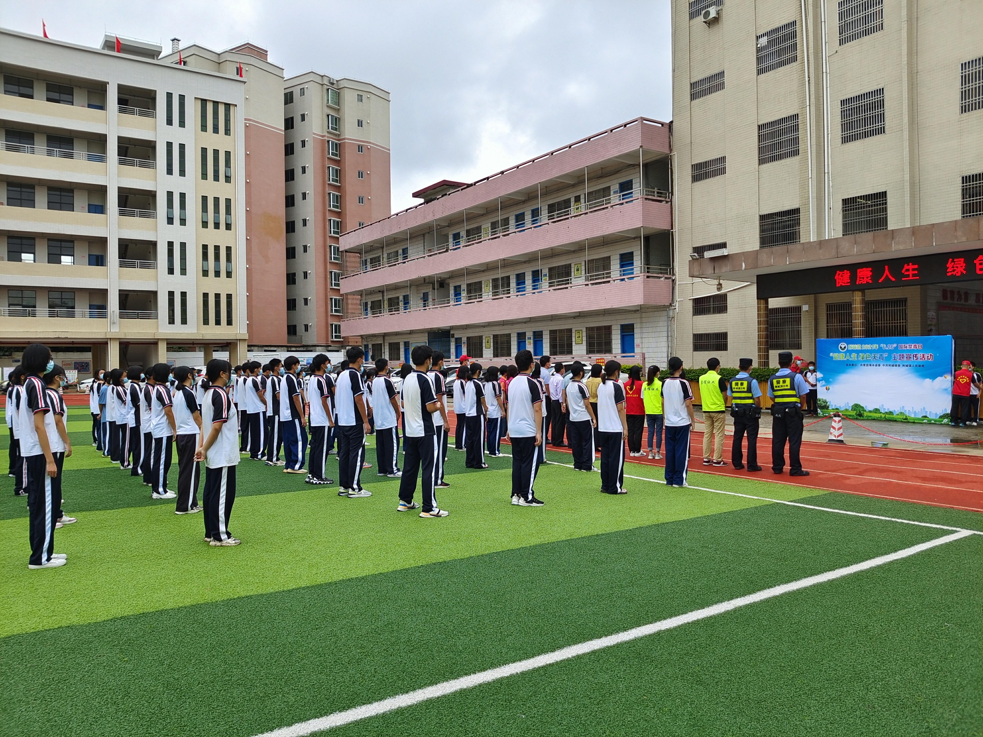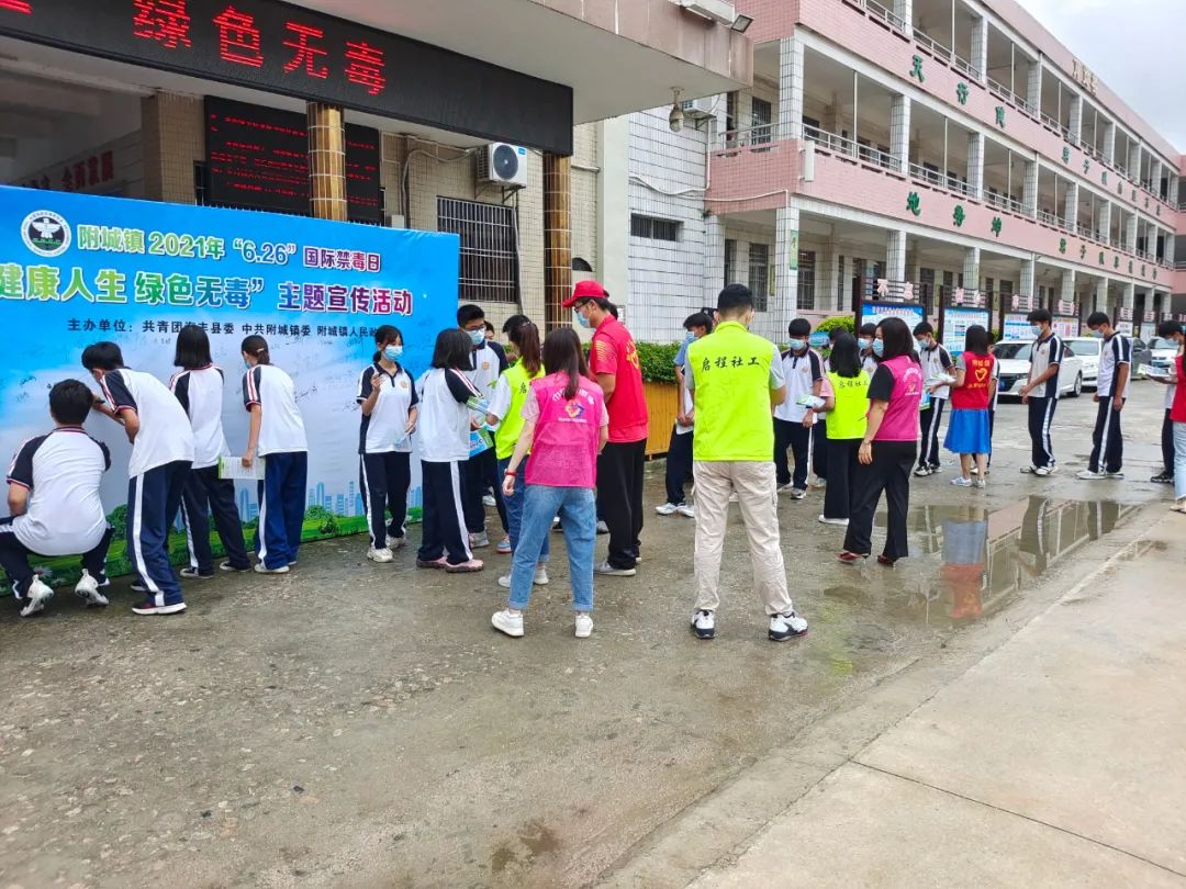 附城镇组织综治办、禁毒办、派出所、共青团、妇联、学校、志愿者、禁毒社工在附城中学开展6·26国际禁毒日“健康人生 绿色无毒”禁毒宣传活动。