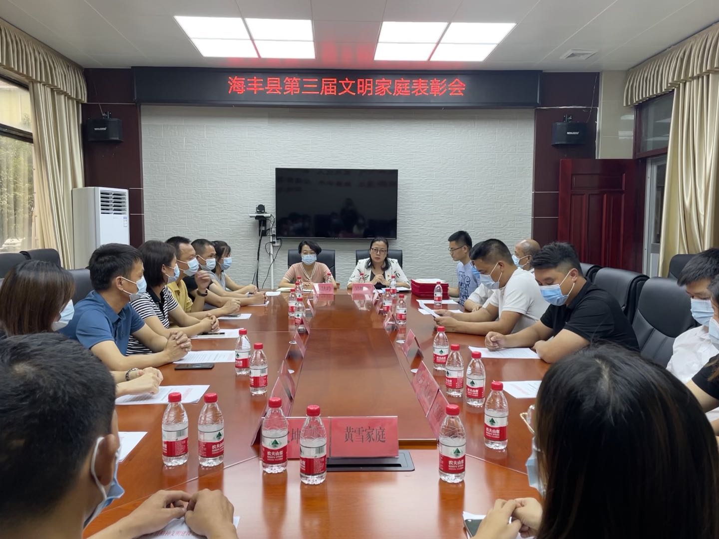 为充分展示我县家庭文明建设丰硕成果,展现城乡广大家庭良好精神风貌,进一步激发文明家庭创建活力,厚植群众性精神文明创建活动基础,6月29日下午,县委宣传部、县文明办、县妇联在县委宣传部会议室召开“海丰县第三届文明家庭表彰会”。