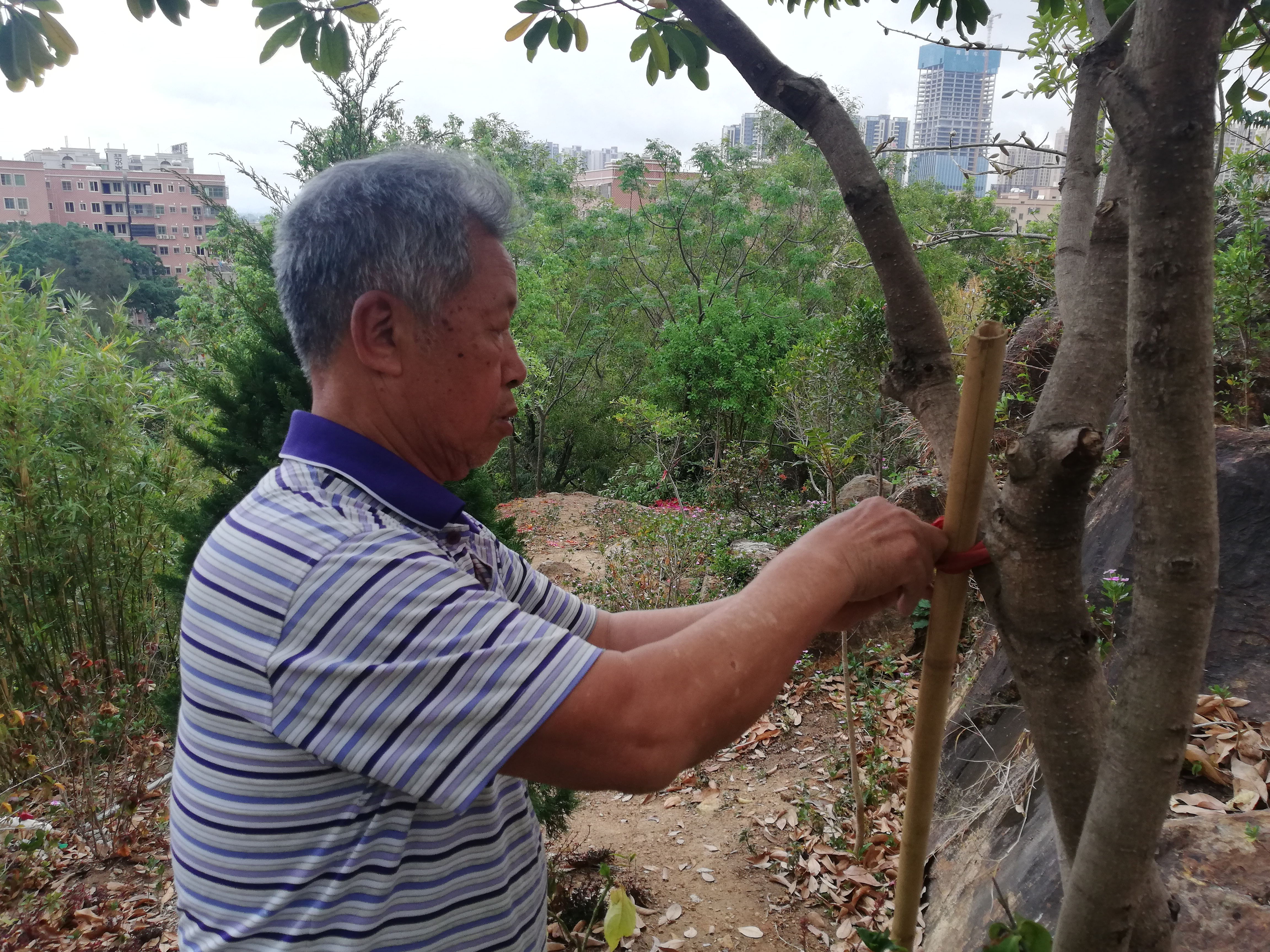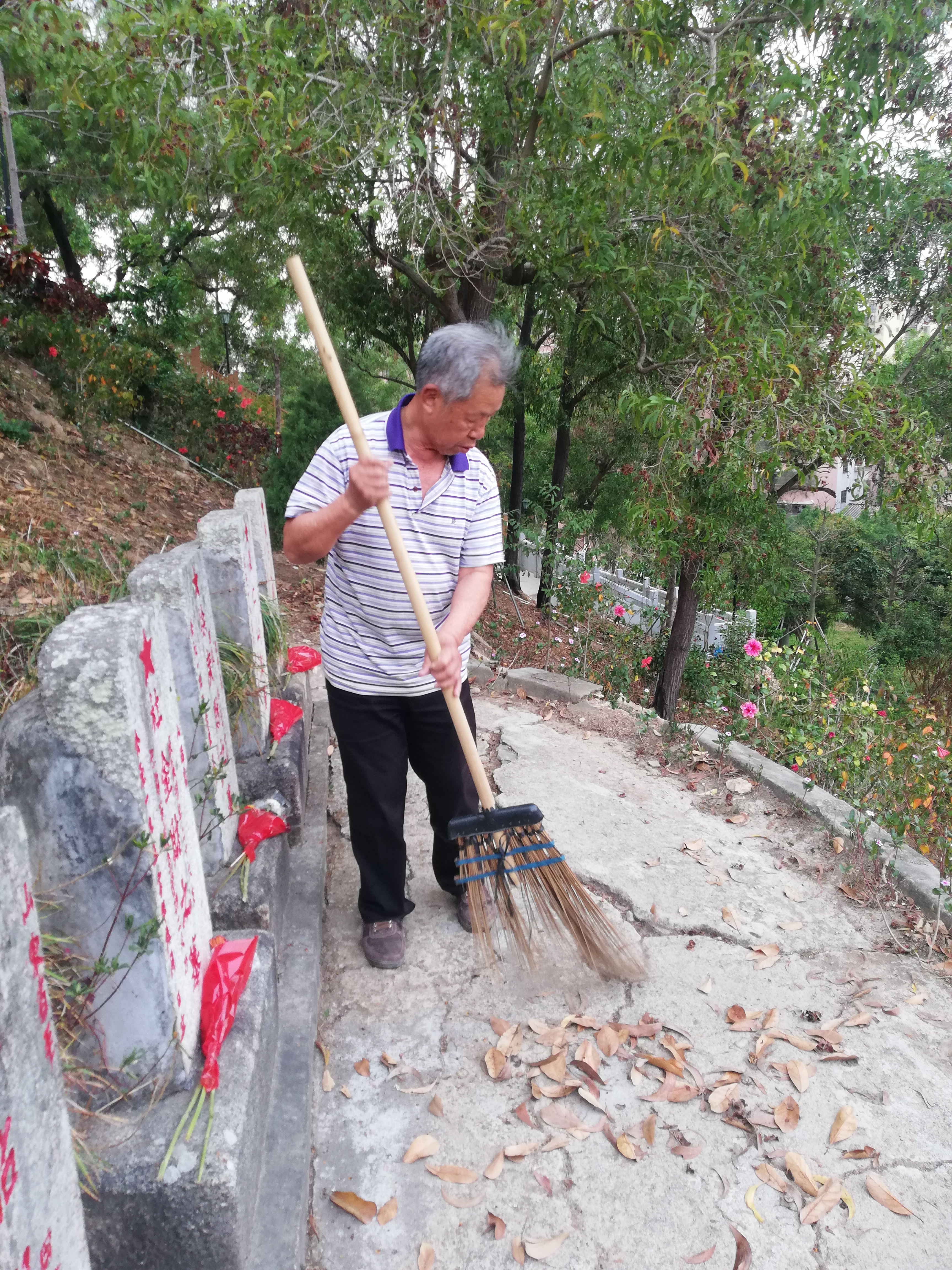 每当晨曦初露或夕阳余晖,在山峦苍翠的海丰县城龙山公园里,总能看见一位古稀老人忙碌的身影。只见他手挥扫帚,沿着100多级台阶拾级而上,打扫着飘落的残枝败叶,时而弓腰俯拾游人乱丢下的矿泉水瓶、塑料袋,时而挥锄除草植绿……他就是海丰县海城镇第一居委径口街上修理单车的师傅翟妈发。