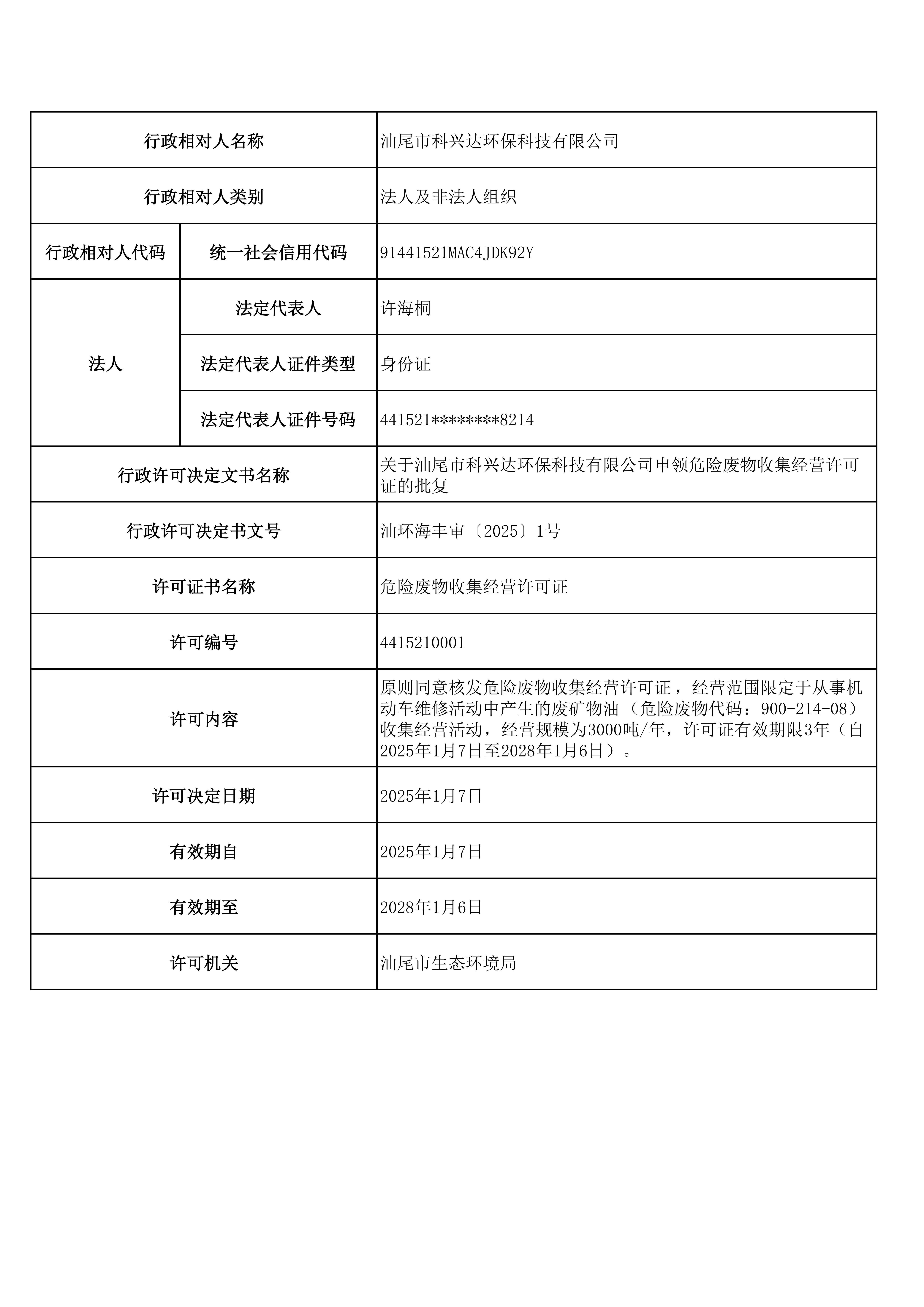 关于汕尾市科兴达环保科技有限公司申领危险废物收集经营许可证的批复