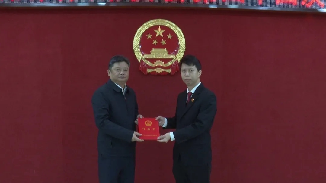 会议通过人事任免事项,任命陈江明、林宇斯为海丰县人民法院审判员,县人大常委会主任肖勇科颁发任命证书。