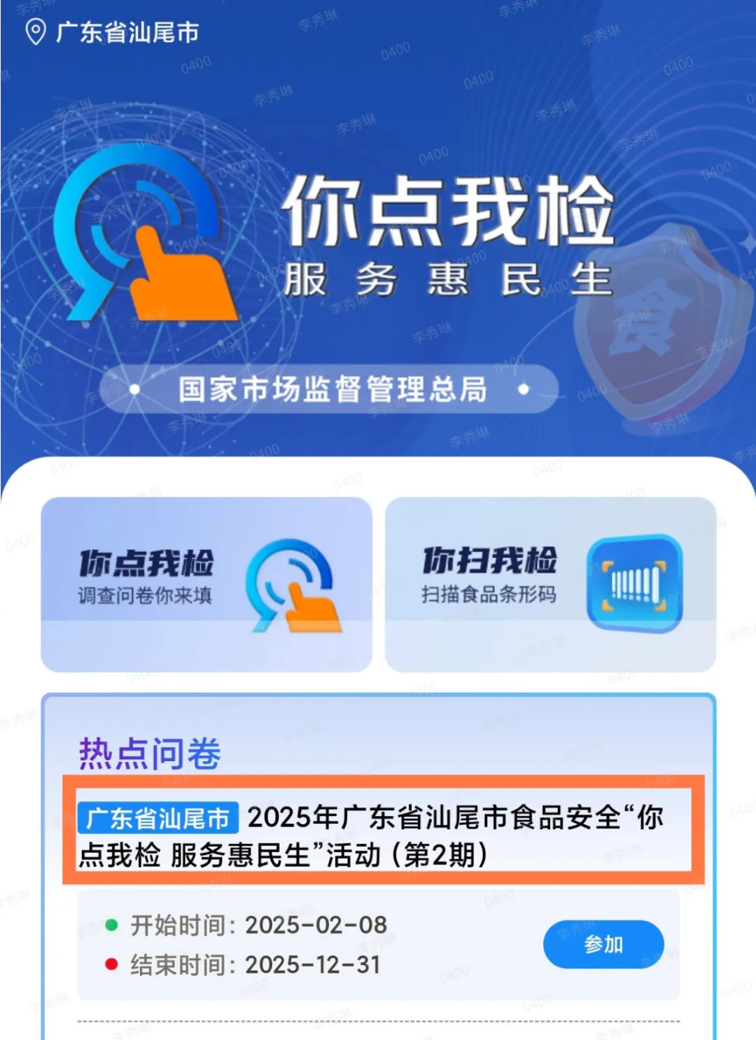 扫码选 随时点2025年汕尾市食品安全“你点我检 服务惠民生” 活动开始了