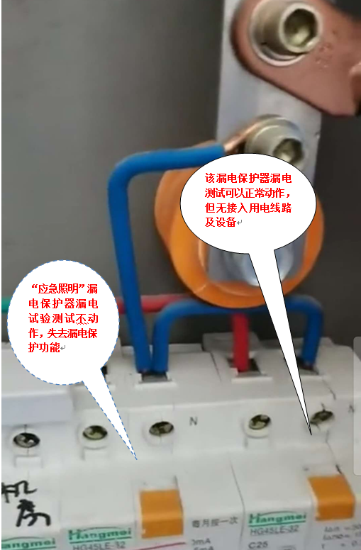2.酒店六楼配电箱为六层用电设备总配电箱,分别配置有两个低压电源漏电保护器,其中一个标注为“应急照明”漏电保护器,经漏电试验测试不动作,已失去漏电保护功能;另一个经漏电试验测试可以正常动作,但无接入用电线路(见图3)。据此确定六楼用电主干线及配电、通信设备间用电设备无漏电保护装置。