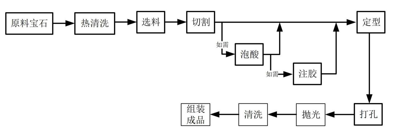 珠宝首饰加工企业生产工艺较为简单,主要以外购石料为原料,对其进行泡酸、注胶、切粒、打孔、抛光等。