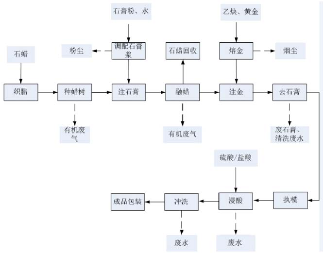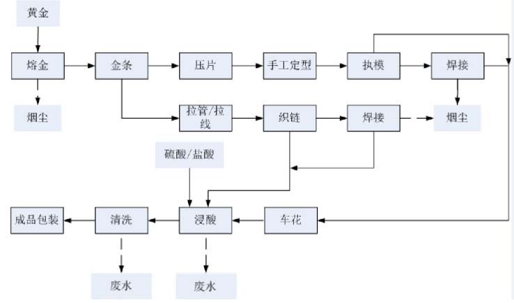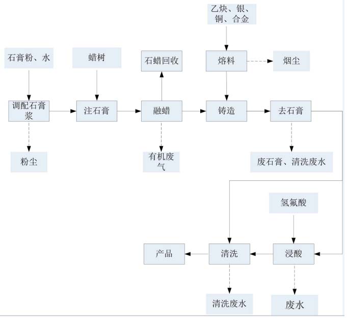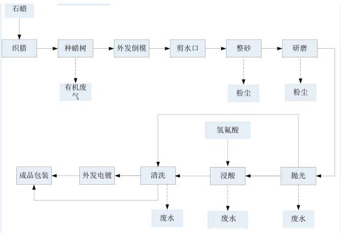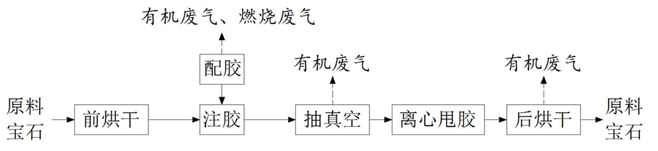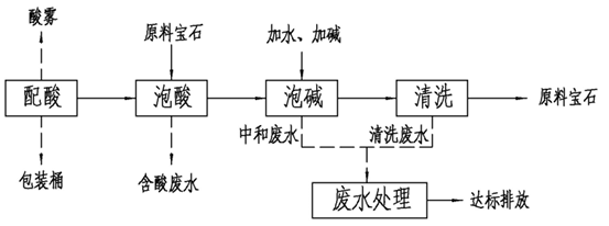 在以上的加工过程中,进厂的宝石原料,因混有泥土等杂质,需通过加热清洗,洗净宝石表面,该过程会产生清洗废水。配酸工序中使用的酸液有盐酸、氢氟酸、硫酸、草酸和硝酸,配酸过程中盖子为开启状态,酸挥发产生酸雾。泡酸及泡酸后的清洗过程会产生酸性废水,特征污染物为ph、氟化物等。注胶工序会产生少量的挥发性有机废气(以VOCs计)、燃料废气。