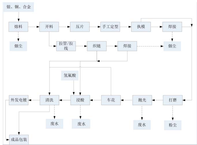 海丰县现有珠宝首饰加工产业主要集聚于可塘镇,主营碧玺、发晶、南红等120多种进口原石料加工的产品,珠宝远销欧美、东南亚、韩国等地区。由于可塘镇宝石工厂(场)大多为家庭式小微企业,分散分布,大部分个体户和企业生产工艺较为简单,仅对原石料进行切割、打孔、抛光。宝石加工中的泡酸和注胶工序则主要委托海丰县金盛宝石首饰有限公司、东维亚珠宝科技产业园、海丰县雅天妮综合环保工业园等集中处理。贵金属首饰主要分布于梅陇镇,主要加工黄金、银、铜和合金四类首饰件,基本上所采用的加工生产工艺相类似,均为首饰加工行业常用的主流工艺,主要涉及设计—起版—压膜—唧蜡—执模—配石—镶石—执边—车花—镀前表面处理—电镀。目前海丰县彩宝废料主要交由本地或珠三角地区的建材厂,作为骨料生产。海丰县暂无首饰贵金属回收与提纯的企业,针对废旧首饰及贵金属的回收、提纯这一重要环节存在明显的产业链缺失。本次对珠宝首饰加工部分典型工艺及其产污环节进行介绍。