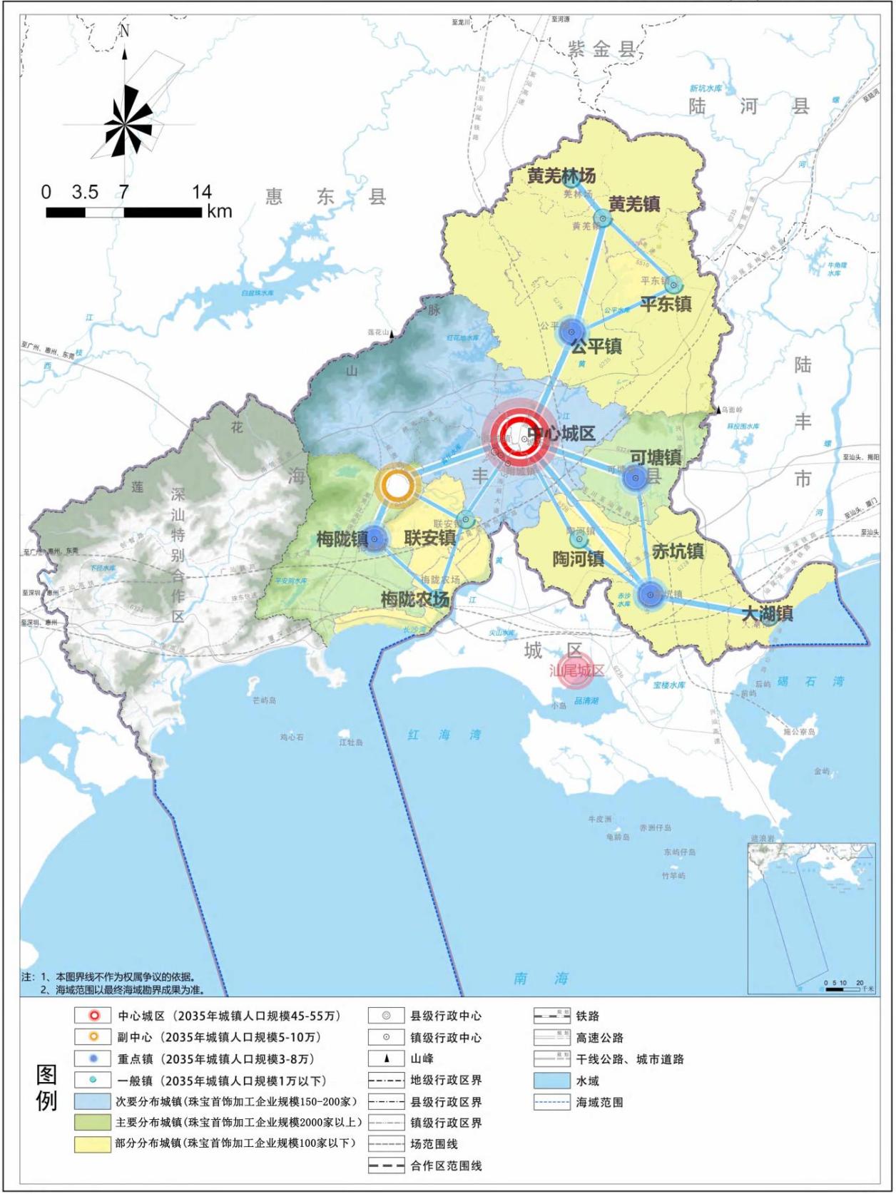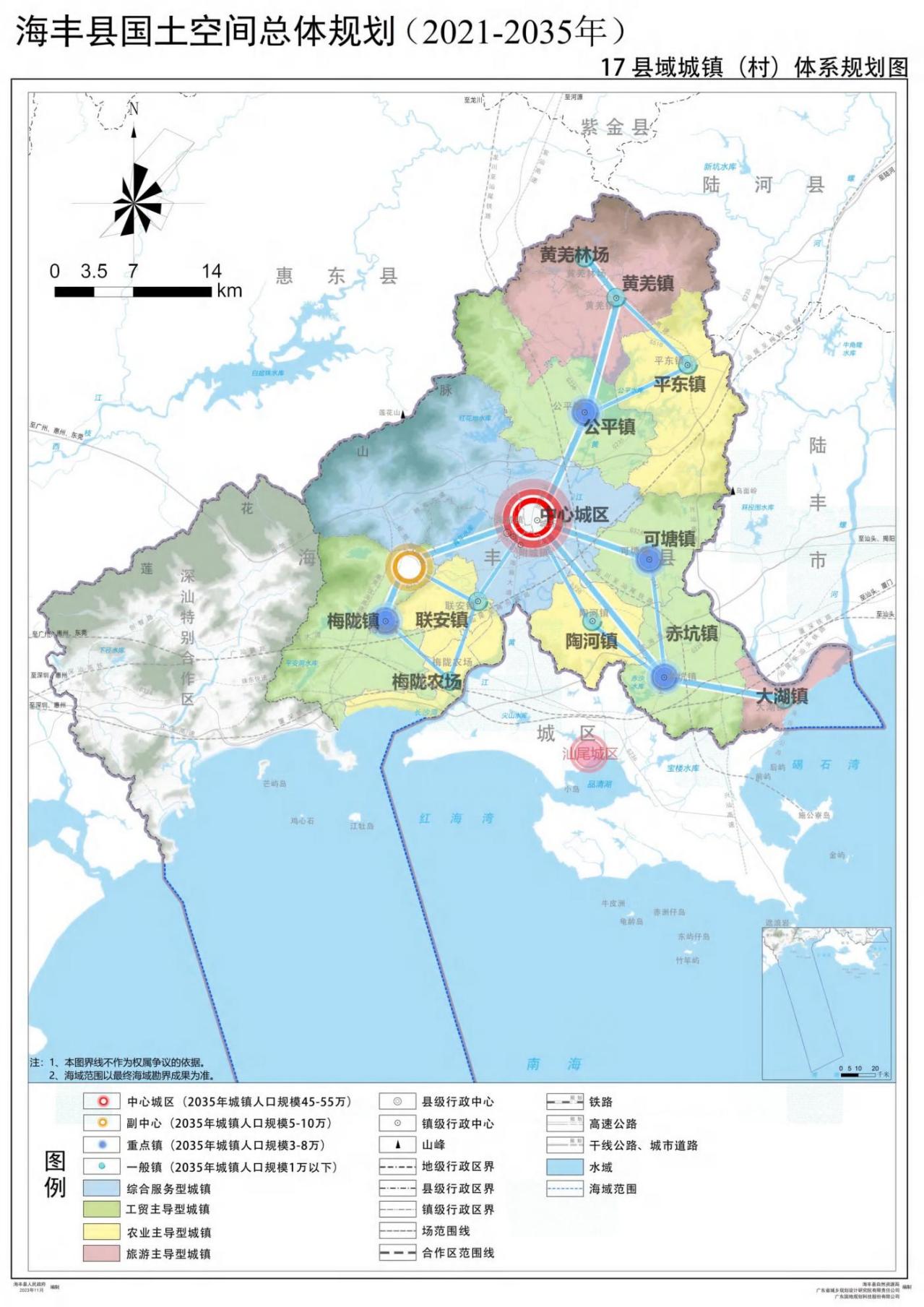 展望到2035年,构建以海丰县城为核心枢纽,梅陇镇、可塘镇为两大副中心,汕尾海丰产业园区、可塘镇长桥工业园等多元创新载体协同发展的“一枢纽两中心多载体”空间布局体系。