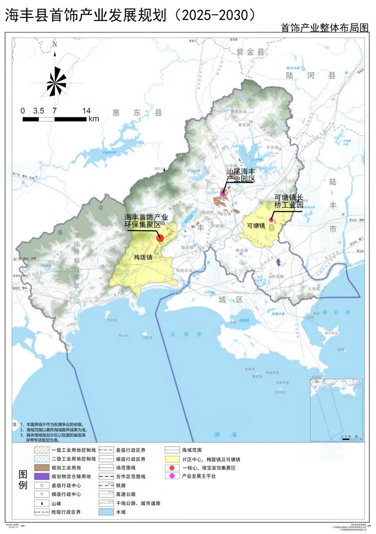 按照汕尾市委、市政府提出的“构建‘万亩千亿’大产业平台,打造一批空间容量大、基础配套优、体制机制活的百亿级产业承载平台”工作要求,围绕推动传统产业改造升级,以海丰县国土空间总体规划为指导,坚持“集约用地、产业集聚、生态优先”原则,推进产业合理布局,引导珠宝首饰加工行业组团式、联结性发展,到2030年形成以海丰首饰产业环保集聚区为行业核心,梅陇镇、可塘镇为片区中心,汕尾海丰产业园区、可塘镇长桥工业园等产业平台联合发展的“一核两片区多平台”,全县统筹发展的格局。