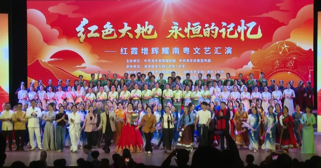 11月3日晚,“红色大地·永恒的记忆”——红霞增辉耀南粤文艺汇演在海丰县影剧院上演。活动以歌声回望烽火历程、以舞姿礼赞百年党恩,纪念抗日战争胜利80周年,庆祝海丰县老干部(老年)大学成立10周年。县委副书记、县长范秉康,县人大常委会主任肖勇科,县委副书记吴家宾,县领导刘啸东、周伟义、蔡碧霞、王朝阳、王胜、张文亮,广东省老干部事务中心,深圳市龙岗区,市、县相关单位负责人以及省、市、县退休老干部代表到场观演。