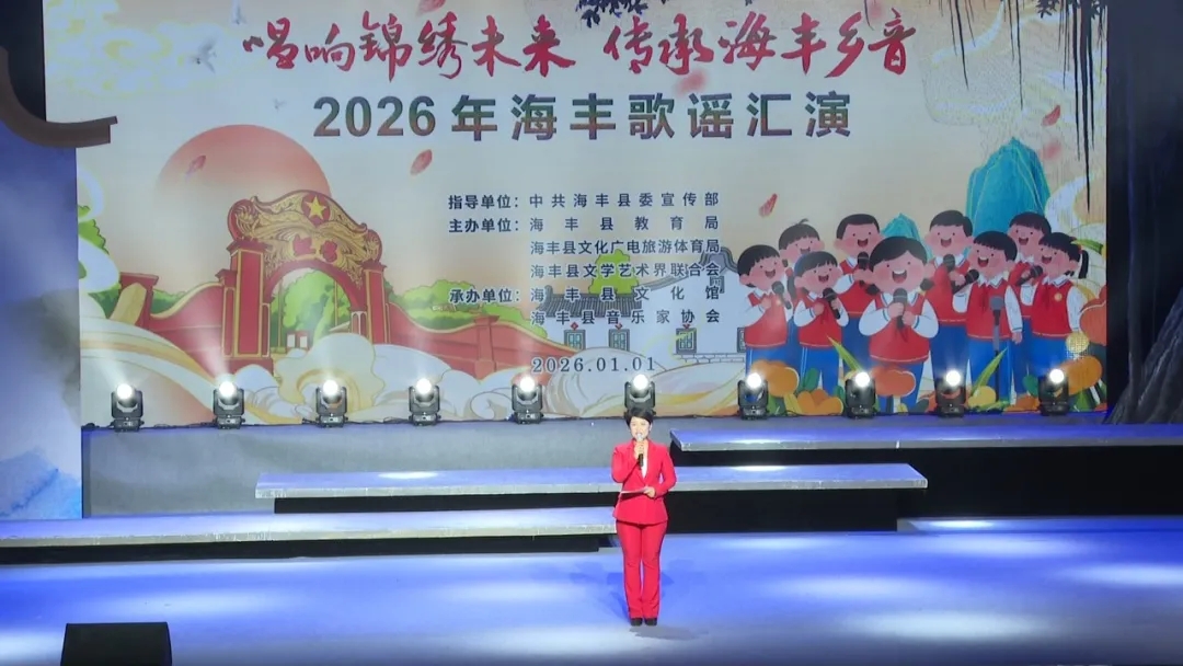 1月1日晚,“唱响锦绣未来·传承海丰乡音——2026年海丰歌谣汇演”在县影剧院举行,全县各幼儿园、中小学校等单位选派的少年儿童代表齐聚舞台,用歌声演绎非遗魅力,以表演传承乡土情怀,为“中国民间文化艺术之乡”海丰注入鲜活的文化生命力。市文广旅体局主要负责人,县委副书记吴家宾,县委常委、宣传部部长许为务,县人大常委会副主任、总工会主席陈岳文,副县长蔡碧霞、罗佳华,县政协副主席柯小林等领导观看演出。