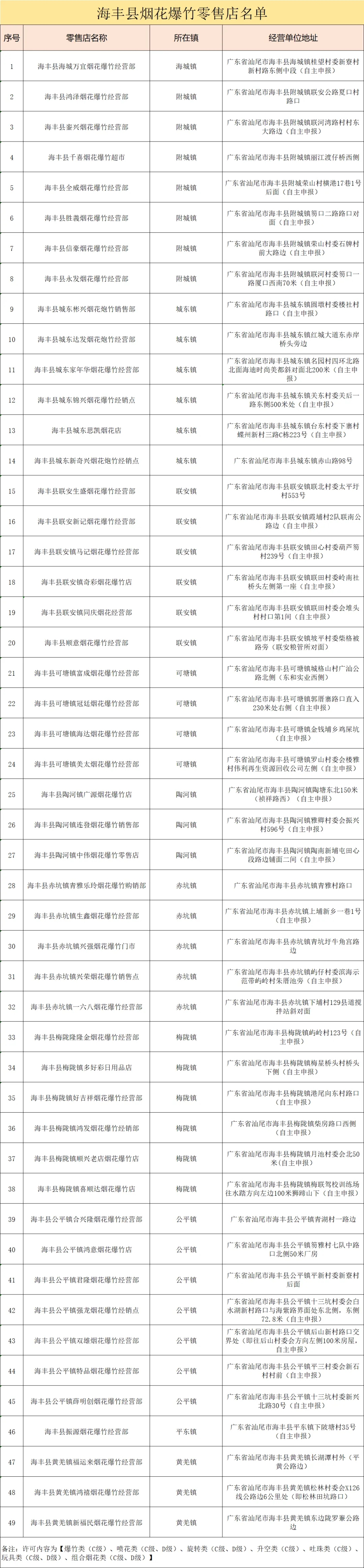 截至2月12日,海丰县审批发证烟花爆竹正规合法零售店共49个(其中海城镇1个、附城镇7个、城东镇6个、梅陇镇6个、可塘镇4个、公平镇7个、联安镇6个、赤坑镇5个、陶河镇3个、黄羌镇3个、平东镇1个),请市民朋友到正规零售店购买烟花爆竹。