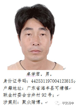 为深入推进扫黑除恶专项斗争的开展,严厉打击赌博违法犯罪,对赌博违法犯罪活动实行“零容忍”,维护好近年来的禁赌成效,营造一个平安、稳定的春节。近日,我局在可塘镇金竹围村查处一宗聚众赌博案,抓获聚众赌博人员28人,卓学君、曾昭旺等2名涉嫌聚众赌博罪嫌疑人负案在逃,海丰县公安局决定对卓学君、曾昭旺等2名涉嫌犯罪在逃人员进行悬赏通缉。
