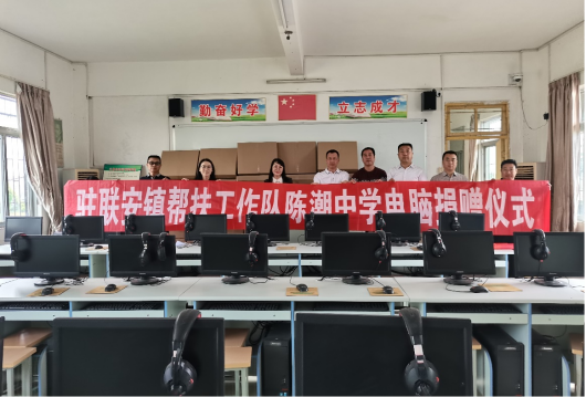 前期,驻镇工作队深入陈潮学校调研,了解到陈潮中学已新建了学生宿舍、食堂、运动场,并配套好各项设施,但作为开展信息技术课科目的学生电脑室设备年久老化,频繁发生故障、损毁问题,已无法正常开展教学,需重新更换电脑室计算机设备,在第一时间对接组团单位了解资源、筹措资金来提升陈潮中学信息化教学教育水平。