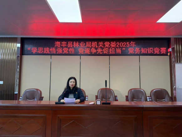 为深入学习贯彻党的二十届四中全会精神,重温党的辉煌历程、感悟初心使命、明晰纪律要求,巩固团结奋斗的共同思想基础,11月28日,海丰县林业局机关党委举办“学思践悟强党性 竞逐争先促担当”党建知识竞赛,50余名党员及发展对象参赛。机关党委书记林燕文致辞时强调:“此次竞赛是检验理论学习成效、推动党建与林业业务融合的重要抓手,希望大家以赛为桥,把党的理论转化为守护绿水青山的实际本领。”