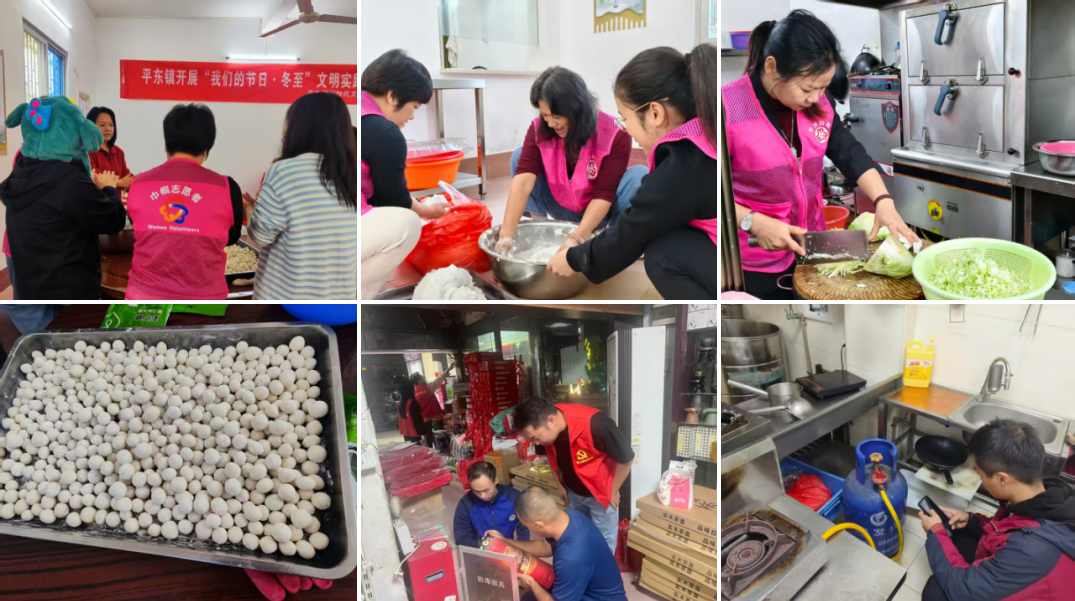 ◆为传承中华优秀传统节日文化,营造温馨和谐的节日氛围,冬至前夕,平东镇开展“我们的节日·冬至”文明实践活动,将传统节庆转化为密切干群关系的温情纽带。清晨的平东镇党群服务中心内热气氤氲、笑语盈盈。联户人员围坐一起、分工明确,有的挽袖揉面,洁白的糯米粉在其手中翻飞;有的切菜、拌馅,香甜的馅料被裹入冬节鸽中;有的聚在灶台边,将煮好的汤圆和冬节鸽整齐分装,一份份饱含心意的冬至祝福渐渐摆上桌案。这份温暖并未停留于室内,联户人员手提保温食盒,穿行在辖区的街巷中,把刚出锅的汤圆送至独居长者与困难群众家中。当刘阿婆从联户人员手中接过热气腾腾的汤圆,连声道谢:“这汤圆暖到心坎里了,谢谢你们总惦记着!”借着入户契机,联户人员“一手送温暖,一手查安全”,同步开展居家消防安全检查,重点排查沿街商铺消防安全设施是否完好、居民家庭用电用液化气是否规范,为辖区安全稳定筑牢防护屏障。