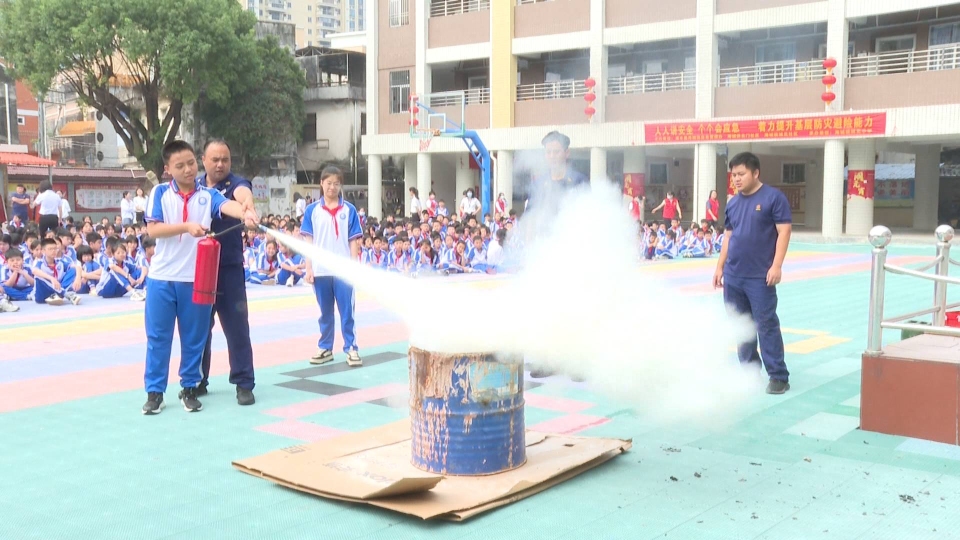 演练模拟地震之时,学校拉响警报并组织学生疏散逃生,同学们在消防人员和老师的指挥下,按照“抱头、蹲下、掩护”的指示要求,沿着预定路线,迅速疏散至指定区域,演练达到预期效果。随后,举行消防安全技能培训,演示、讲解防溺水基本自救知识、防毒面具和灭火器的使用,并指导学生正确操作消防器具。